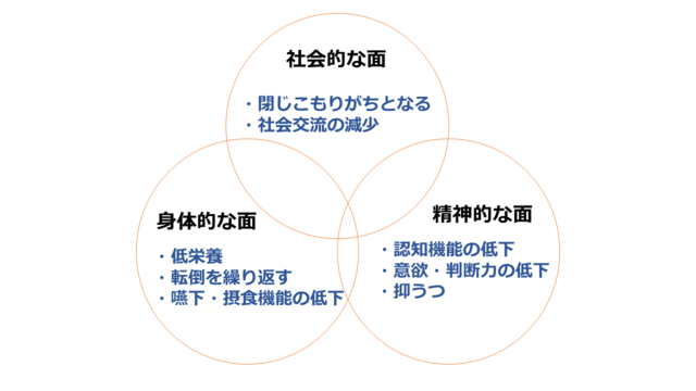 体重減少、疲労感、活動量の低下、歩行速度の低下、握力の低下などが主な症状です。原因としては、低栄養や身体活動の低下が挙げられます。